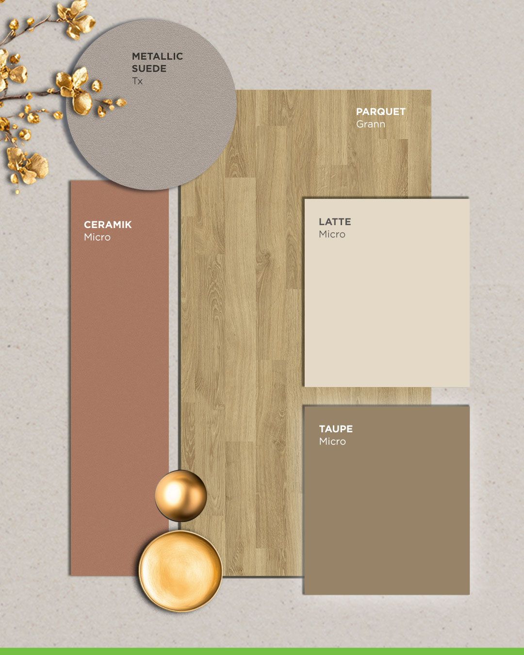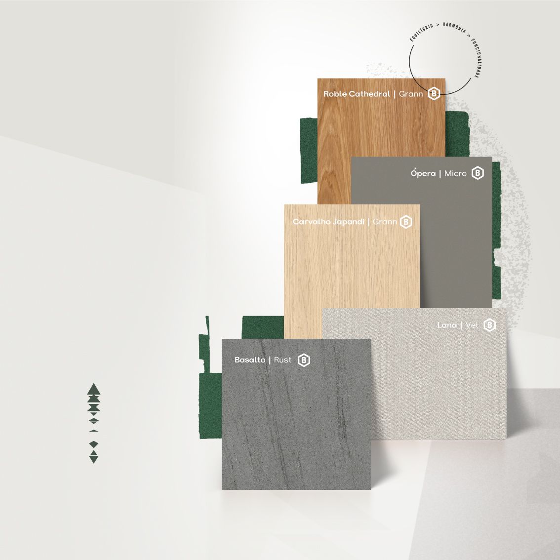 A versatilidade do Parquet se revela também na facilidade de combinação com outros padrões e cores. Entre as sugestões da Coleção Horizontes, o Latte se destaca por sua suavidade, criando composições acolhedoras e equilibradas. O Taupe, por sua vez, oferece uma base neutra e sofisticada, ideal para projetos que buscam um visual contemporâneo e atemporal. Já o Metallic Suede adiciona um toque de modernidade e brilho sutil, enquanto o Ceramik proporciona personalidade, valorizando ainda mais o padrão geométrico do Parquet.